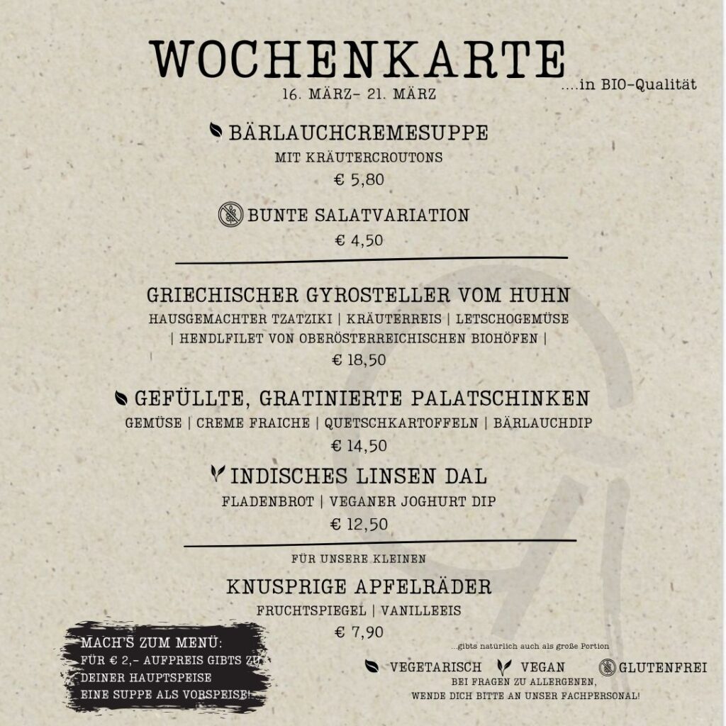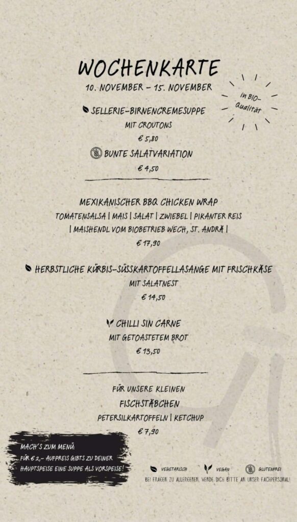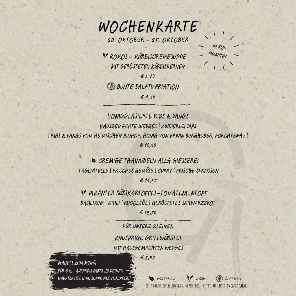 „Wir kochen mit biologischen Zutaten, möglichst aus der Region. Auch unsere Getränke sind aus biologischer Erzeugung, ein spezielles „GIESSEREREI-Bier“ wird extra für uns aus biologischen Zutaten gebraut. Den Tag startet man bei uns mit herzhaften oder süßen Frühstücksvariationen. Zu Mittag gibt es verschiedene Gerichte – auch vegan oder vegetarisch – zur Auswahl. In der Kuchenvitrine finden sich stets herrlich süße Versuchungen.“